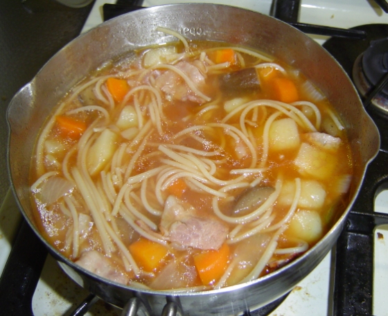 シチュー・スパゲッティ(写真)です。だいぶ前に作ったんだけど。野菜入れて煮て、最後に折ったパスタを入れ、ケチャップで味付けするだけ。簡単ですよ。最近のパスタ熱もこれで一段落って感じです。チョイト休んで何か新しいものに挑戦しますかね。