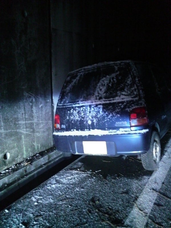 本郷インターの近くのコンビニで待ち合わせだったんだけど、1人家を出るときに凍結した道路で滑って、車が溝にハマってしまって来れないと。で、救出に行くことに。高速乗って尾道まで戻って、現場へ。見事に左側がハマっとります。牽引ロープで引っ張りあげました。左側が壁なので持ち上げられなかったので。