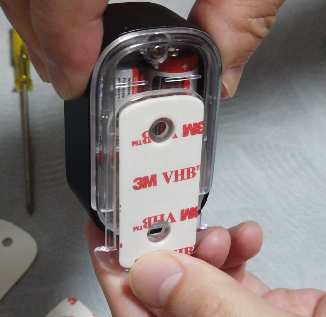 外す時に両面テープが強力で外せなくてマイナスドライバー突っ込んでゴリゴリ外したんだけど、これで電池切れの時にすぐに交換できるので便利だわ。