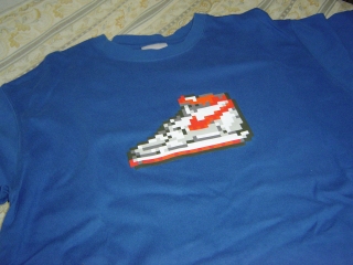 何かドット絵ブームに乗せられてるんじゃないの?って感じだが、昔から注目してたよ。ディスプレイが白黒で解像度が低かった頃の携帯の待受画面を作ってた時はドッターを極めようかと思ってたしね。前に買ったこのNIKEのシャツもドット絵。イイ感じでしょ?